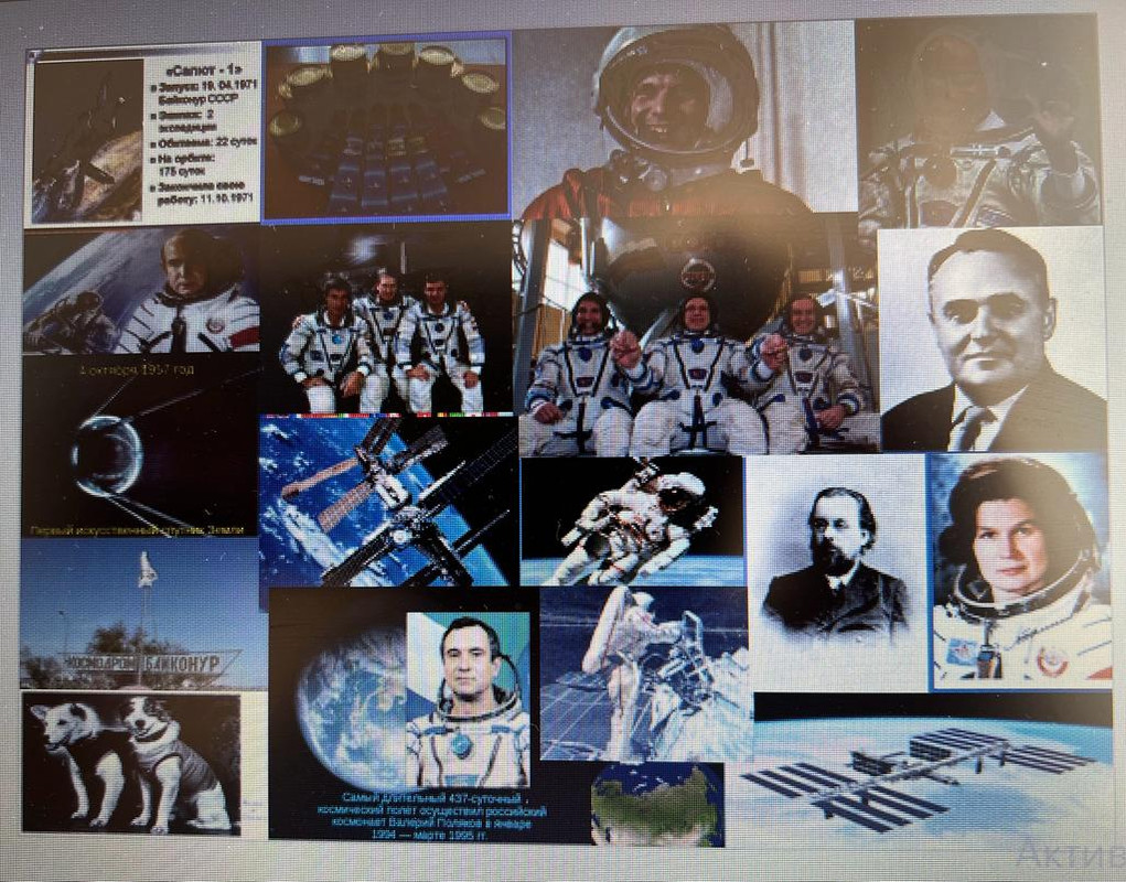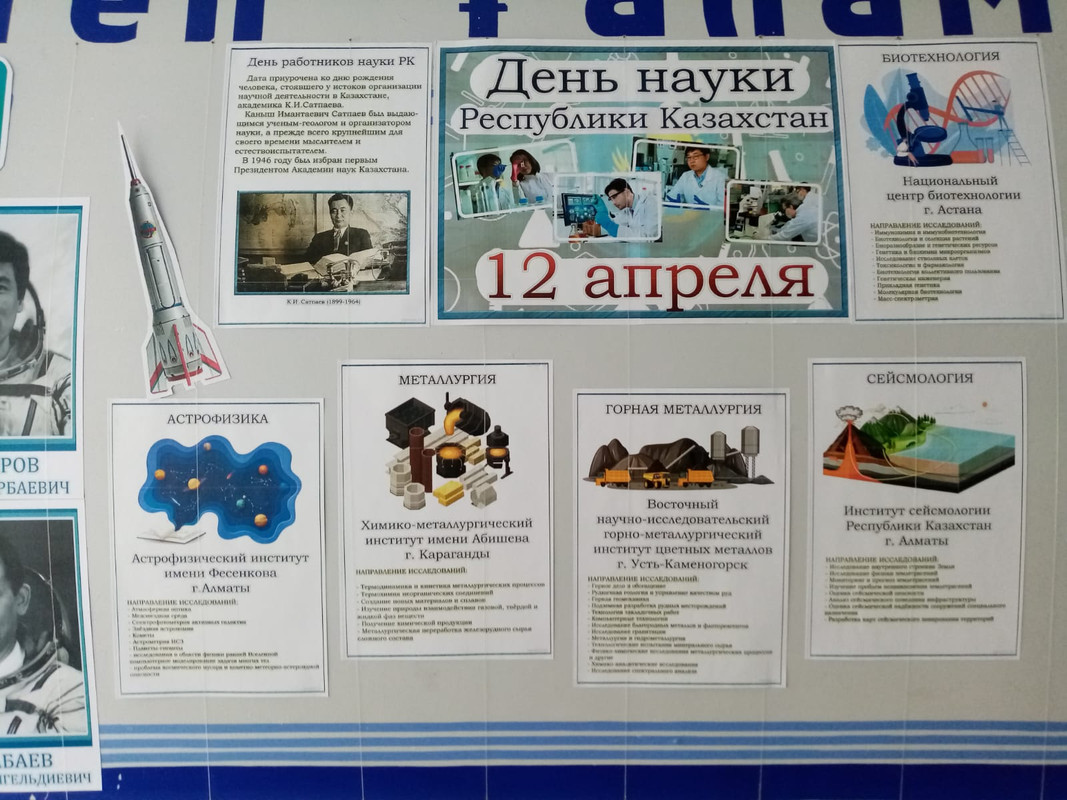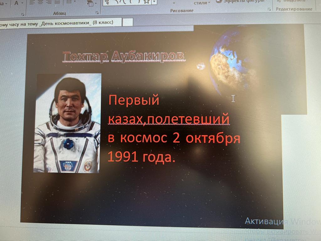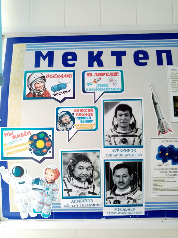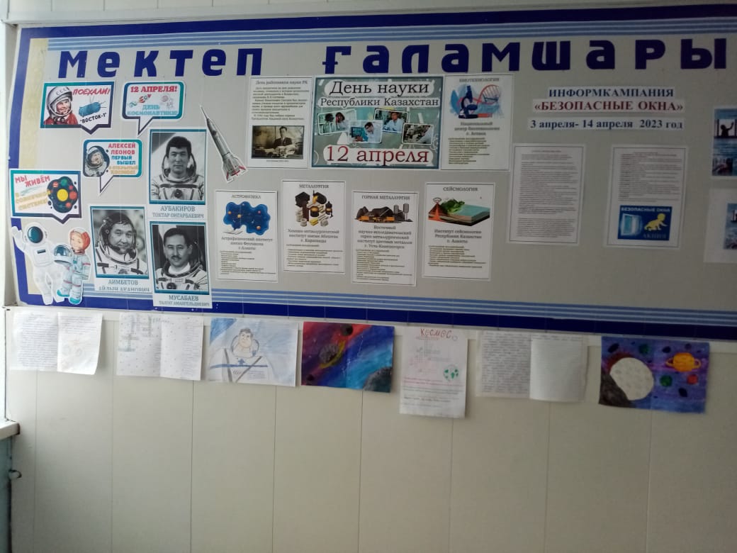1961 жылы 12 сәуірде жер шарының халқын дүр сілкіндірген оқиға болды-планетаның орбитасында адаммен бірге ғарыш кемесі болды. Бұл кеңестікте ұшқыш Юрий Гагарин болды, ол ұшқаннан кейін әлемдегі ең танымал және танымал адамға айналды. Оның әйгілі фразасы басталған кезде «Кеттік!»бұл адамзаттың жаңа дәуірге тез енуінің символына айналды. Бірінші ұшудың жарты ғасырлық мерейтойына (2011 жыл) БҰҰ мерекені жаңа деңгейге көтерді — ол халықаралық адамның ғарышқа ұшу күні деп аталды. Бірақ әдетті, сыйымды және танымал бірінші атау-Космонавтика күні. «Мектеп планетасы» стендінде әлемдегі алғашқы ғарышкер Ю.А.Гагарин, А.А.Леоновтың портреттері бар «Ғарыштық ізашарлар» айдары жасалды. Стендте қазақстандық ғарышкерлердің портреттері ерекше орын алады: Т.О.Әубәкіров, Т.А.Мұсабаев, А.А.Айымбетов.