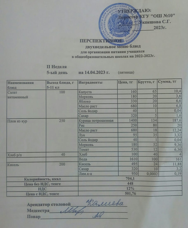 Перспективное (рекомендуемое) двухнедельное меню блюд для организации питания учащихся начальных классов в общеобразовательных школах за счет бюджетных средств на 2022-2023 год 2 неделя на 14.04.2023 (пятница)