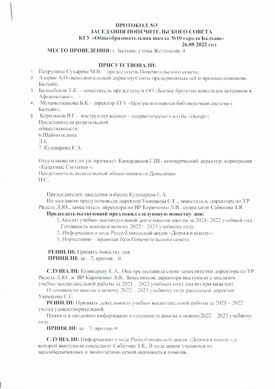 ПРОТОКОЛ №3 ЗАСЕДАНИЯ ПОПЕЧИТЕЛЬСКОГО СОВЕТА КГУ «Общеобразовательная школа №10 города Балхаш» от 26.08 2022 год