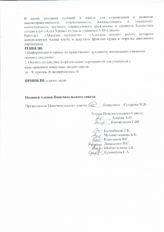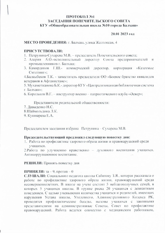 ПРОТОКОЛ №1 ЗАСЕДАНИЯ ПОПЕЧИТЕЛЬСКОГО СОВЕТА КГУ «Общеобразовательная школа №10 города Балхаш» от 20.01.2023