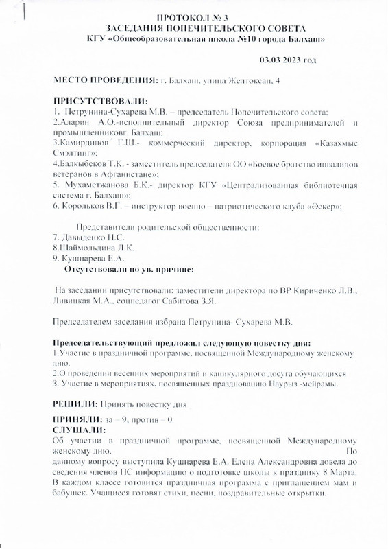 ҚАМҚОРШЫЛЫҚ КЕҢЕСІНІҢ ОТЫРЫСЫ № 3 ХАТТАМА 03.03.2023 жыл «Балқаш қаласының №10 жалпы білім беретін мектебі» КММ