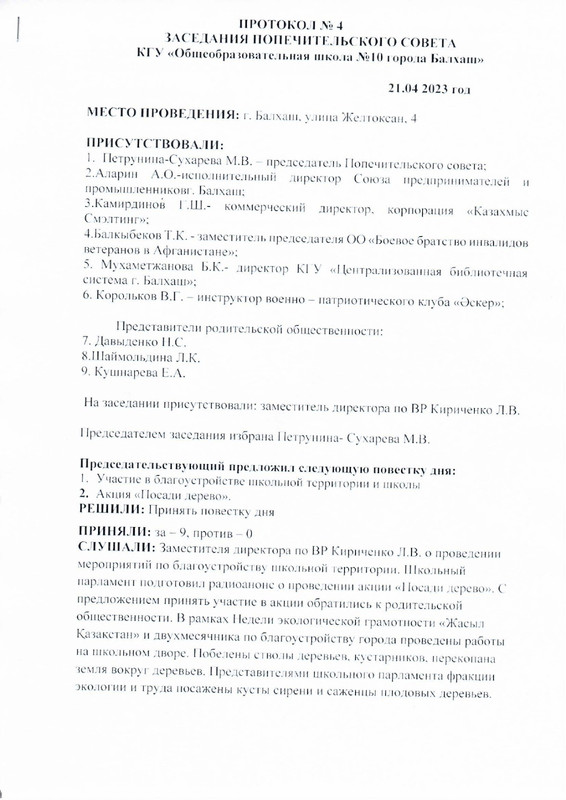 ПРОТОКОЛ №4 ЗАСЕДАНИЯ ПОПЕЧИТЕЛЬСКОГО СОВЕТА КГУ «Общеобразовательная школа №10 города Балхаш» от 21.04.2023