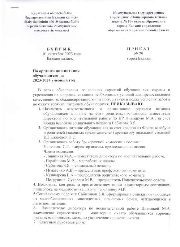 Приказ по организации питания обучающихся на 2023-2024 учебный год