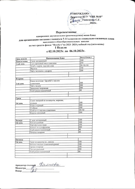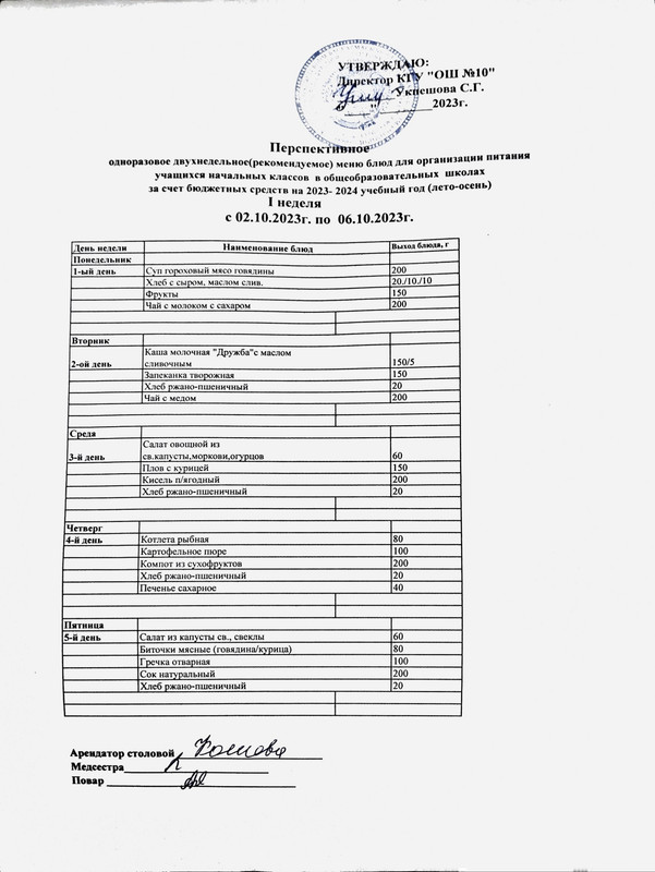 2023-2024 жылдарға арналған бюджет қаражаты есебінен жалпы білім беретін мектептердегі бастауыш сынып оқушыларын тамақтандыруды ұйымдастыру үшін перспективалы (ұсынылатын) екі апталық ас мәзірі 1 апта 04.10.2023 (сәрсенбі)