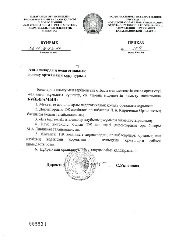 02.10.2023 жылғы «Ата-аналарды педагогикалық қолдау орталығын құру туралы» № 127 бұйрық
