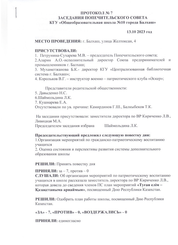 ҚАМҚОРШЫЛЫҚ КЕҢЕСІНІҢ ОТЫРЫСЫ № 7 ХАТТАМА 13.10.2023 жыл «Балқаш қаласының №10 жалпы білім беретін мектебі» КММ