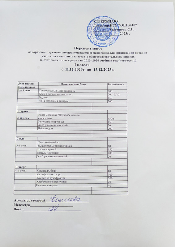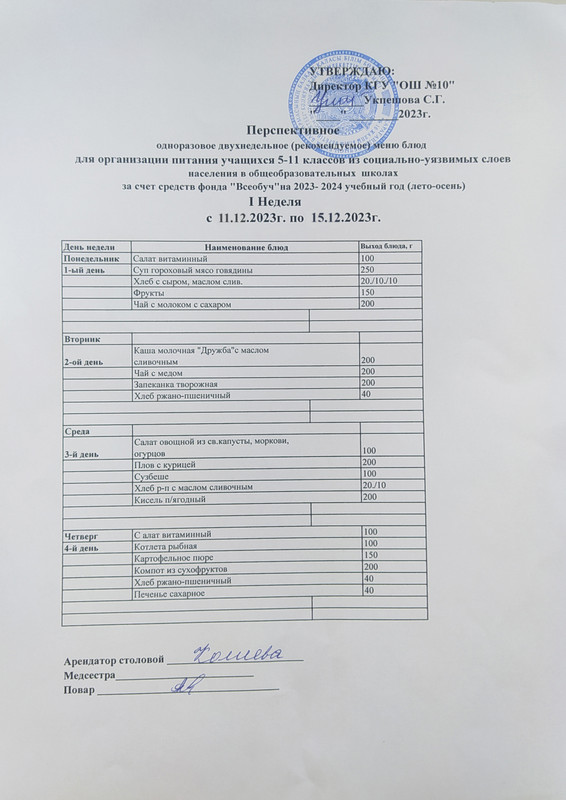 2023-2024 жылдарға арналған бюджет қаражаты есебінен жалпы білім беретін мектептердегі оқушыларын тамақтандыруды ұйымдастыру үшін перспективалы (ұсынылатын) екі апталық ас мәзірі 1 апта 11.12.2023 (дүйсенбі)