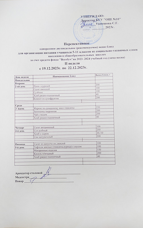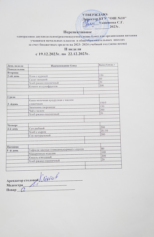 2023-2024 жылдарға арналған бюджет қаражаты есебінен жалпы білім беретін мектептердегі оқушыларын тамақтандыруды ұйымдастыру үшін перспективалы (ұсынылатын) екі апталық ас мәзірі 2 апта 22.12.2023 (жұма)