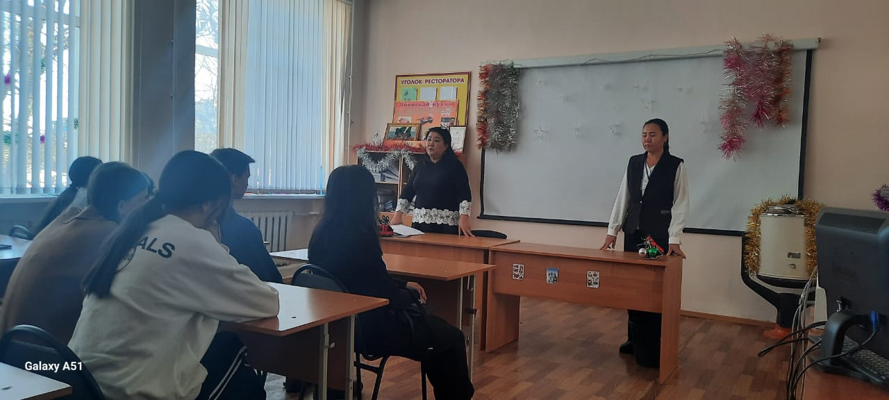 Оқу орнының әдіскері оқушыларды қандай мамандықтар бойынша оқыту керектігі, қабылдау ережелері, осы мамандықтардың еңбек нарығындағы жағдайы, болашақ түлектердің кәсібі бойынша жұмысқа орналасу кепілдігі туралы таныстырды. Әңгімелесуден кейін оқушылар өздерін қызықтыратын тақырып бойынша сұрақтар қойды.