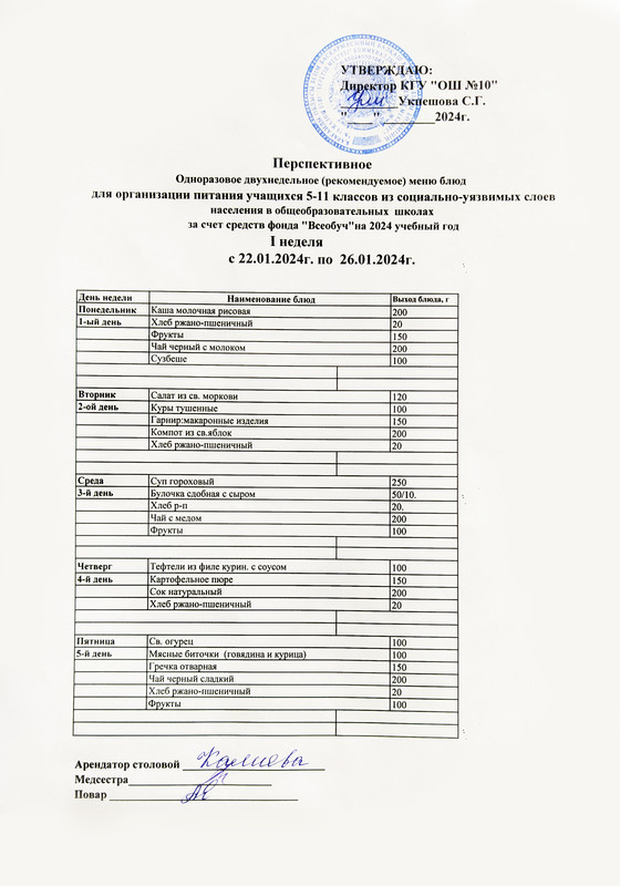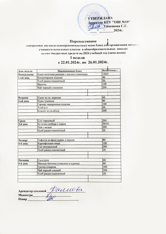 Перспективное (рекомендуемое) двухнедельное меню блюд для организации питания учащихся в общеобразовательных школах за счет бюджетных средств на 2023-2024 год 1 неделя на 22.01.2024 (понедельник)