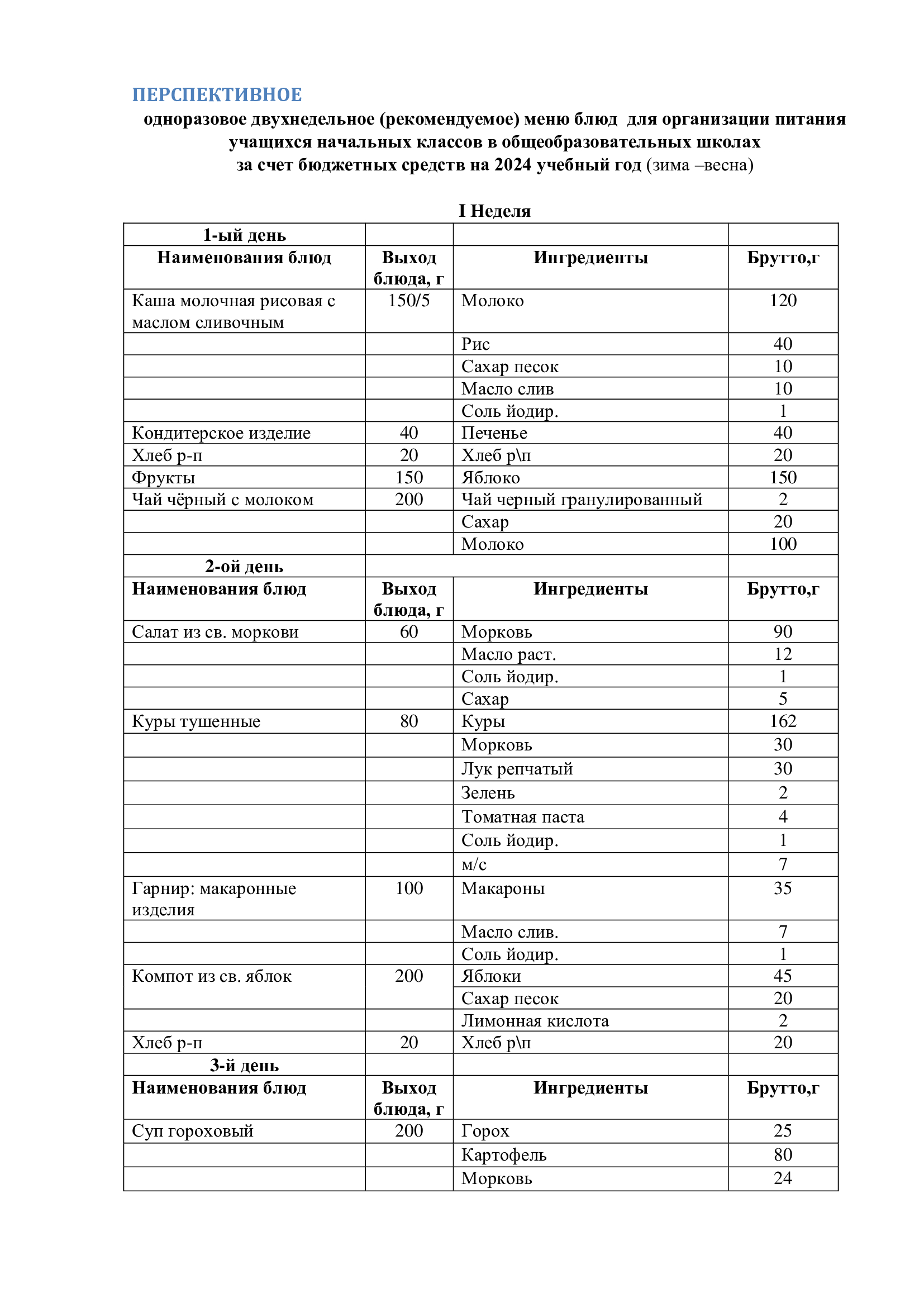 ПЕРСПЕКТИВНОЕ одноразовое двухнедельное (рекомендуемое) меню блюд для организации питания учащихся начальных классов в общеобразовательных школах за счет бюджетных средств на 2024 учебный год (зима –весна)