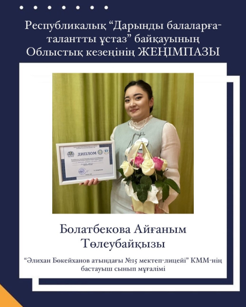 20 ақпан күні Республикалық “Дарынды балаларға-талантты ұстаз” байқауының облыстық кезеңінен мектеп-лицейіміздің бастауыш сынып мұғалімі Айғаным Төлеубайқызы 1 орынды иеленіп, Республикалық кезеңге өтті. Республикалық кезеңде Қарағанды облысының намысын қ