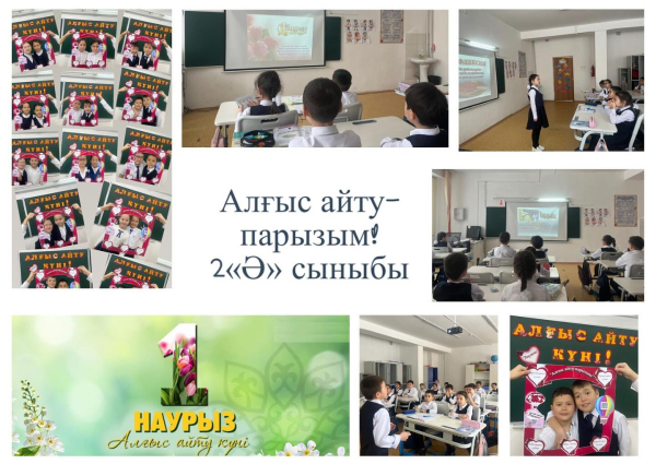 1 ші наурыз алғыс айту күні аясында 2 «Ә» сыныбымен “Алғыс айту-парызым” атты сынып сағаты өтті. Анаға – өмір сыйлағаны үшін, Әкеге – қорған болғаны үшін, Далаға – гүлдері мен көк шалғыны үшін, Сөзге – жанды жылытатыны үшін, Күнге – шуағы мен назары үшін,