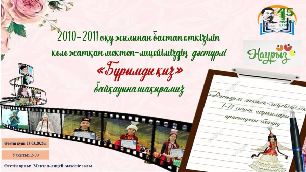 18.03.2025 “Ұлттық киім күні” Наурыз мейрамына байланысты “Әлихан Бөкейханов атындағы №15 мектеп-лицейі” КММ-де дәстүрлі “Бұрымды қыз” байқауы өтеді.