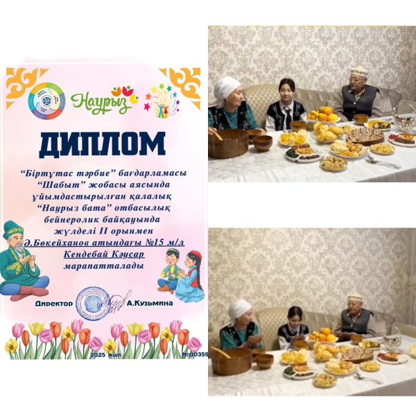 Кендебай Каусар, ученик 6 «А» класса «Школы-лицея №15 имени Алихана Бокейханова» занял 2 место в городском конкурсе семейных видеороликов «Наурыз бата», организованном в рамках проекта «Шабыт» программы «Интегрированное образование». ПОЗДРАВЛЯЕМ