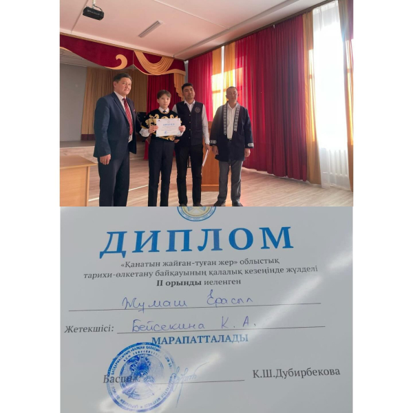 19.03.2025 күні «Қанатын жайған – туған жер» облыстық тарихи –өлкетану байқауының қалалық кезеңінде жүлделі ІІ орында 7 «А» сынып оқушысы Жұмаш Ерасыл жеңіп алды. Жетекшісі: Бейсекина К.А