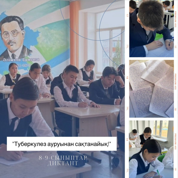24 наурыз - Дүниежүзілік туберкулезбен күрес күніне орай 8-9 сынып оқушыларымен “Туберкулез ауруынан сақтанайық!” тақырыбында диктант жазды. Ұйымдастырушылар: қазақ тілі мен әдебиет пәні мұғалімдері.