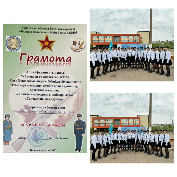 29.04.2025 Учащиеся школы-лицея № 15 имени Алихана Бокейханова заняли первое место в городском песенном конкурсе «Девиз нации – самые смелые» среди учащихся, проходившем в КМУ «Школа-гимназия № 7 имени Сакена Сейфуллина». ПОЗДРАВЛЕНИЯ