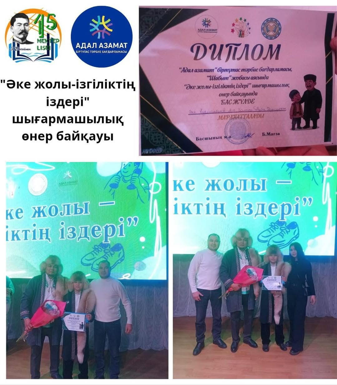 На городской творческий конкурс «Путь отца — следы доброты» от школы-лицея участвовали отец Курманбеков Асет и сын Туяк Нурсултан.