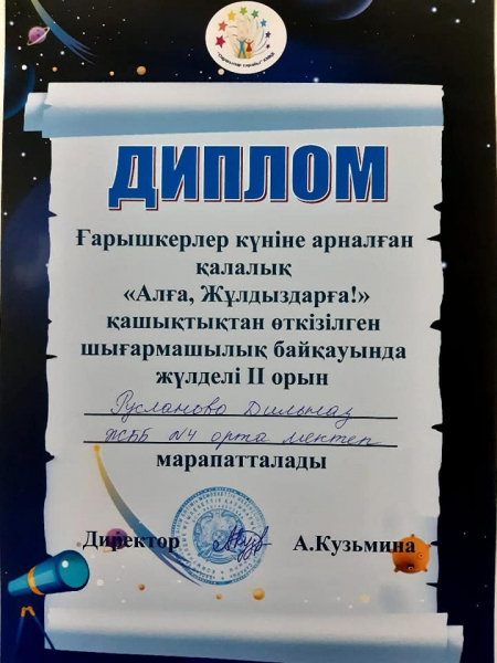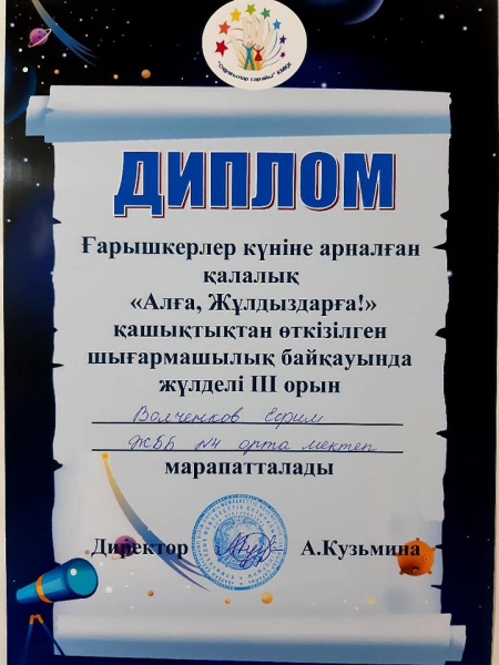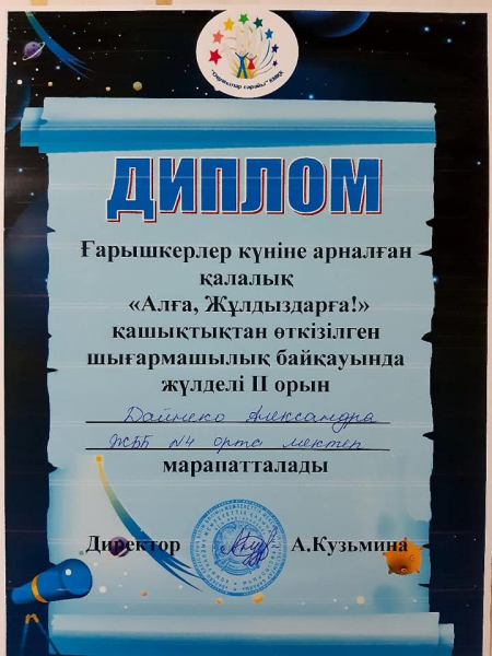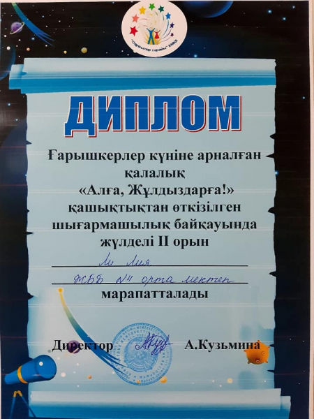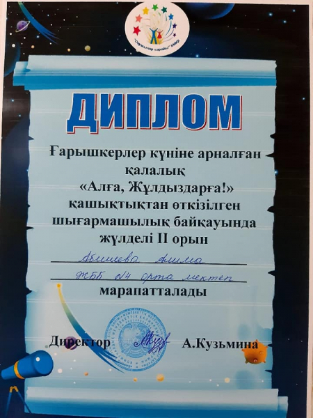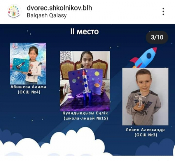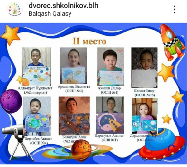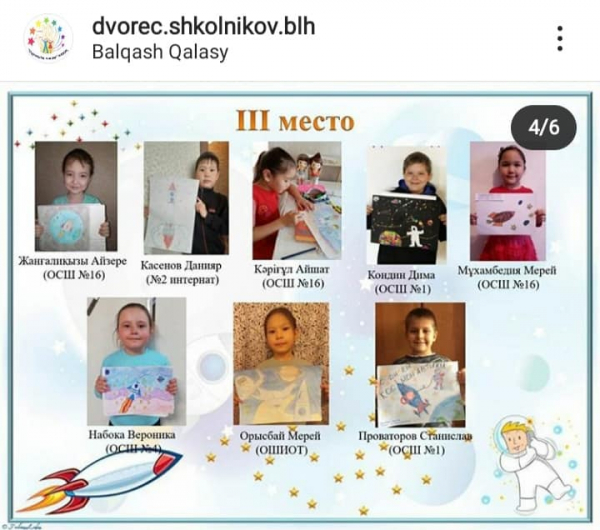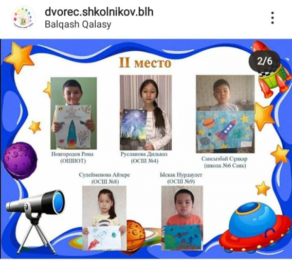 13.04.2020 г. Дворцом Школьников организован городской конкурс поделок и рисунков на тему "Алға, Жұлдыздарға". В данном конкурсе приняли 20 учащихся нашей школы. Ребята проявили творчество, фантазию и оригинальное решение своих работ.