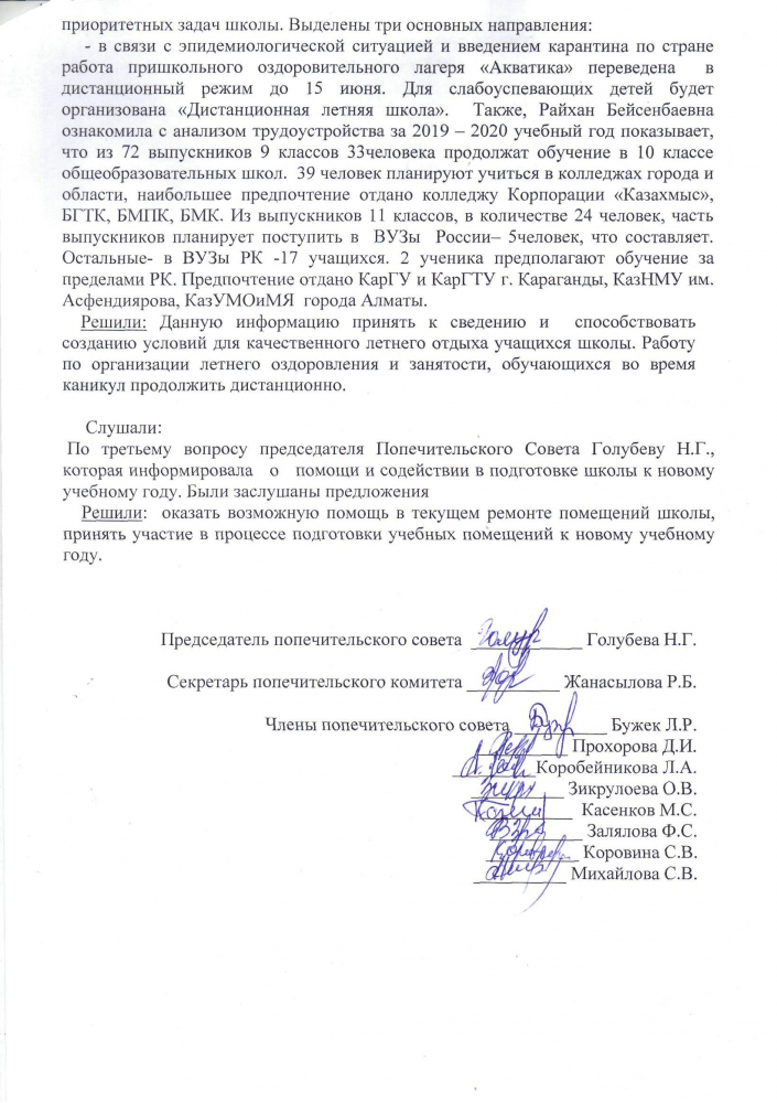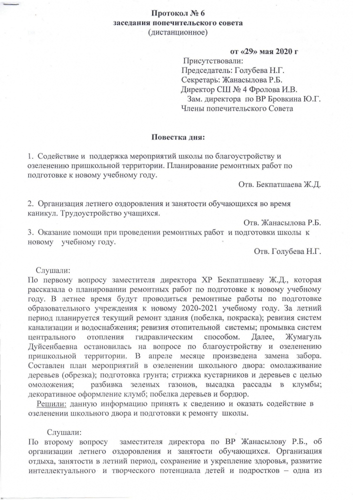 Протокол № 6 заседания попечительского совета школы (дистанционное) от 29.05.2020 г.