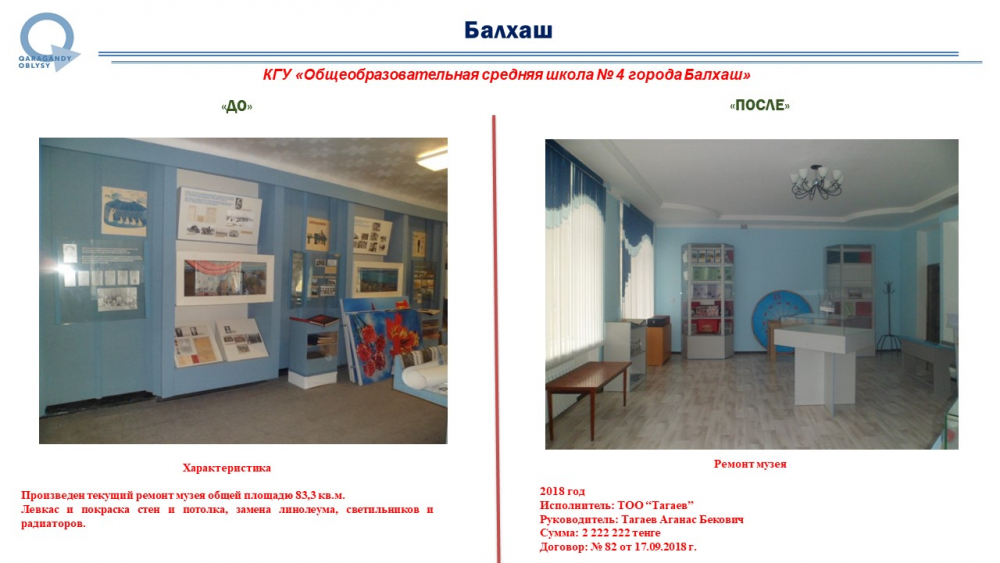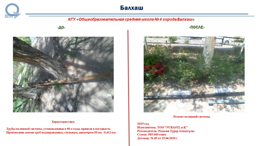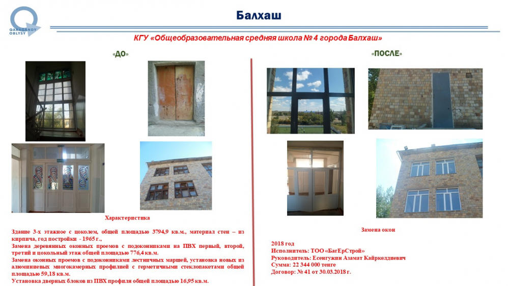 Ремонтные работы по КГУ “ОСШ № 4 г. Балхаш” за 2018-2020 год в рамках госпрограмм
