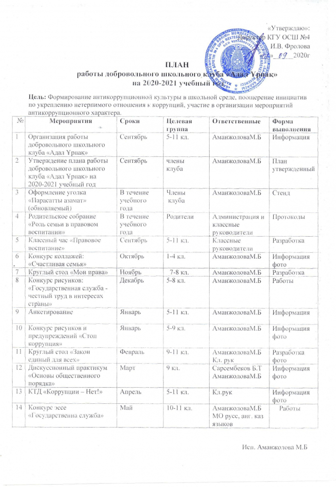 План работы добровольного школьного клуба "Адал ұрпақ" на 2020-2021 учебный год