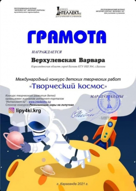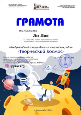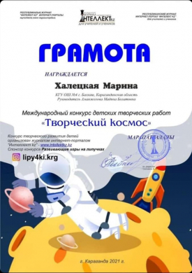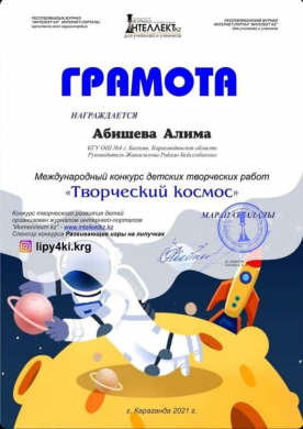 Учащиеся КГУ ОШ № 4 приняли участие в международном конкурсе детских творческих работ “Творческий космос”. Конкурс творческого развития детей организован журналом интернет- порталом “Интеллект kz”.