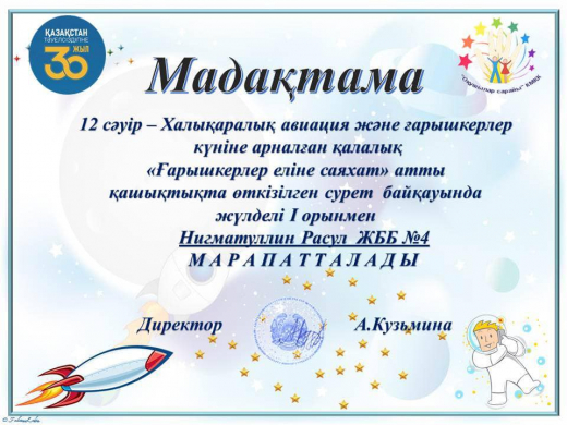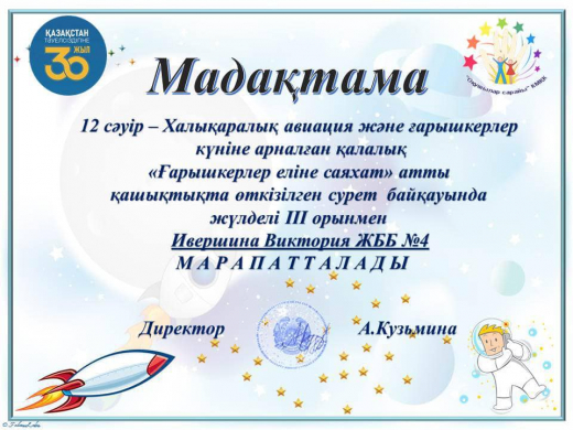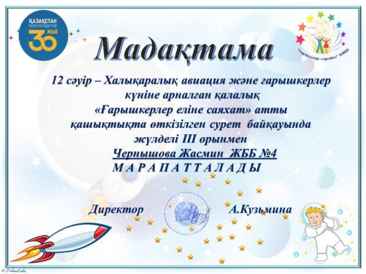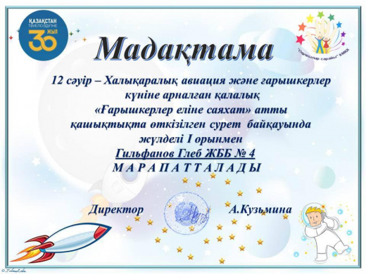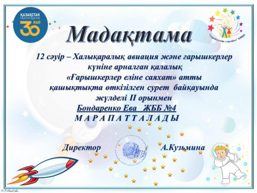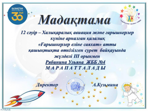 В преддверии это даты учащиеся КГУ ОШ № 4 приняли участие в дистанционном конкурсе рисунков “Путешествие в страну космонавтов”. Ребята изобразили звезды, планеты, кометы, космические корабли и др. Работы, выполненные акварелью, гуашью, цветными карандашами и другими художественными материалами, получились яркими и индивидуальными.