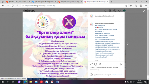 В КГУ «ОШ№ 4» г. Балхаш, ученики пришкольной летней площадки «Акватика» поучаствовали в городской викторине «Ертегілер әлемінде» который организовал досуговый центр «Балауса-2021» КГКП «Дворец школьников». Поздравляем наших активных учеников с полученными грамотами.