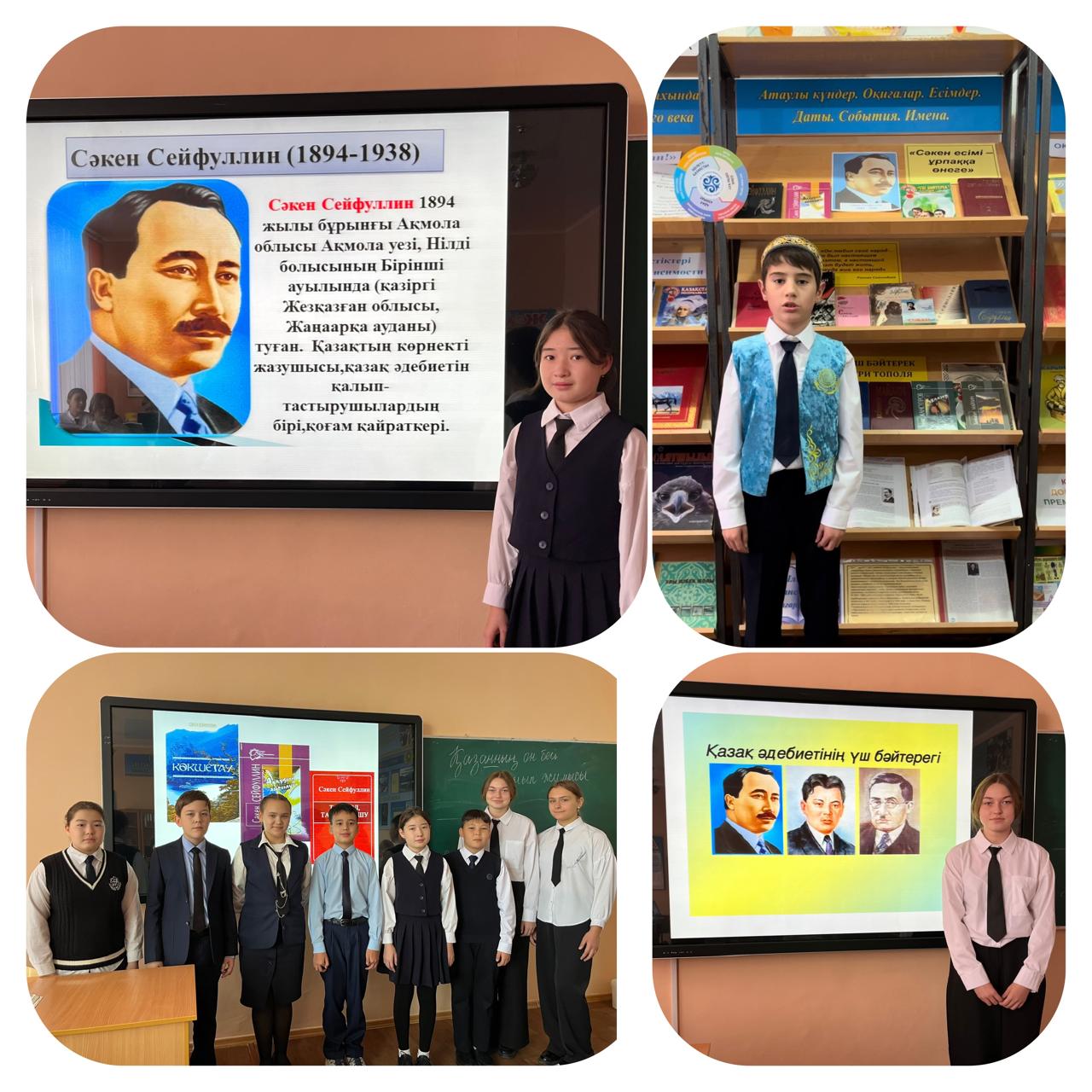 15 қазанда қазақ әдебиетінің негізін құраушы, көрнекті ақын, жазушы, драматург және ірі қоғам қайраткері, үш бәйтеректің бірі Сәкен Сейфуллиннің туғанына 130 жыл толады. Атаулы күнге орай ЖББ №4 мектебінде 5-7 сынып оқушылары арасында  Сәкеннің  өмірі мен шығармалары жайлы таныстырылып, өлеңдері мәнерлеп оқылды.15 қазанда қазақ әдебиетінің негізін құраушы, көрнекті ақын, жазушы, драматург және ірі қоғам қайраткері, үш бәйтеректің бірі Сәкен Сейфуллиннің туғанына 130 жыл толады. Атаулы күнге орай ЖББ №4 мектебінде 5-7 сынып оқушылары арасында  Сәкеннің  өмірі мен шығармалары жайлы таныстырылып, өлеңдері мәнерлеп оқылды.