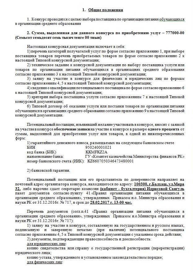 Об утверждении конкурсной документации по выбору поставщика услуги по организации питания обучающихся в организации среднего образования на 2017 г.