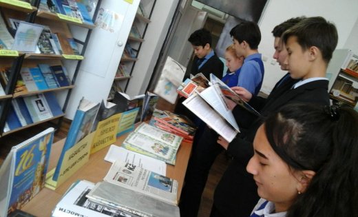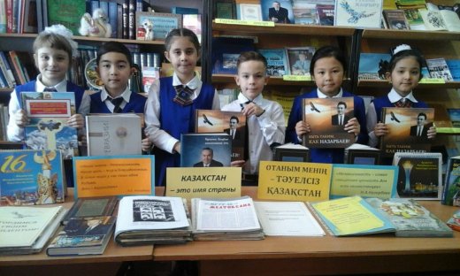 Библиотечным центром школы оформлена тематическая полка, где учащиеся изучили выставку книг на тему «Менің  отаным - Қазақстан», иллюстрации о природе нашего края, великие изречения казахских поэтов, пословицы о Родине на казахском языке.