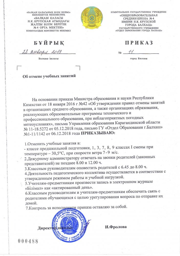 Приказ № 11 от 28.01.2019 г. "Об отмене учебных занятий"