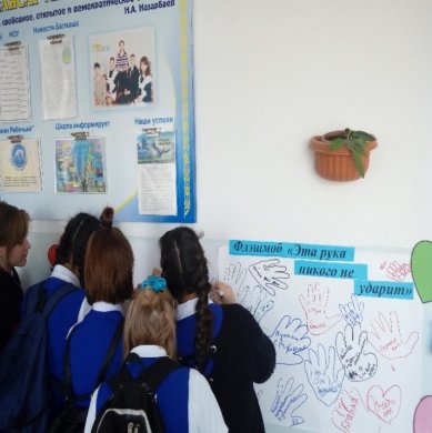 14.02 проведен флешмоб «Эта рука никого не ударит», которая заинтересовала учащихся 7-9 классов. Ученики оставляли на плакате очертания своих рук и пожелания – в знак того, что насилие недопустимо. Во флешмобе приняли участие больше 100 человек