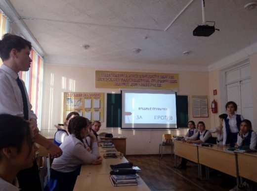 15.02 учащиеся 9 классов приняли участие в дискуссионной площадке «Вредные привычки «за» и «против». Спикеры аргументировано доказывали, что влияние вредных привычек на организм может быть необратимо, влияет на здоровье, разрушает семьи, приводит к деградации. На что оппоненты говорили о пользе наркотических веществ в медицине, о возможности расширения бизнеса, используя вредные привычки людей. Участники дискуссиивыдвигали корректные аргументы, на что оппоненты опровергали тезисы. Дискуссия способствовала формированию уверенности в отстаивании своей позиции, помогла приобрести навыки командной работы, сформировать сознательный взгляд на вредные привычки.