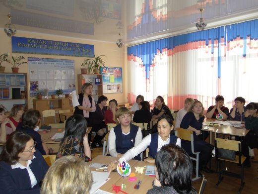 Весь ход мероприятия продвигался по схеме: самообучение и взаимообучение. Жанасылова Р.Б. поделилась своим опытом работы, рассказала, какие активные формы применяет в работе с ученическим коллективом, как проектирует воспитательную систему в школе с учетом интересов детей, их способностей. Познакомила присутствующих с активными приемами работы; организовала работу в группах, во время которой педагоги решали различные ситуации и проблемы, дискуссировали на тему «Как воспитать успешную личность», «Как разрешить конфликт с родителями?». Участники мастер класса проигрывали ситуации, обсуждали и решали проблемы в работе с трудными учениками.