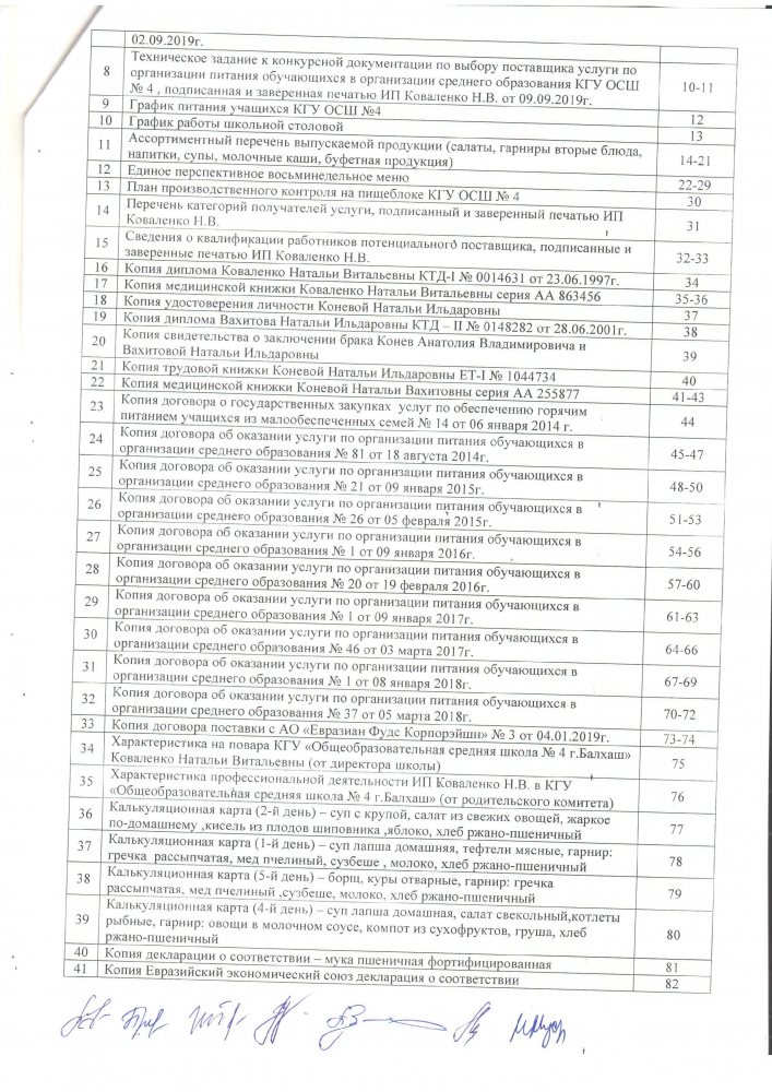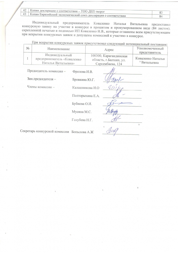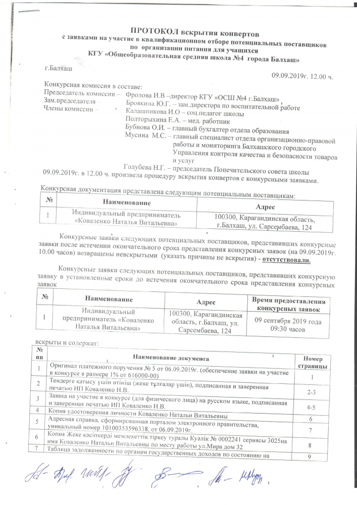 Протокол вскрытия конвертов с заявками на участие в квалификационном отборе потенциальных поставщиков по организации питания для учащихся КГУ "Общеобразовательная средняя школа № 4 города Балхаш"