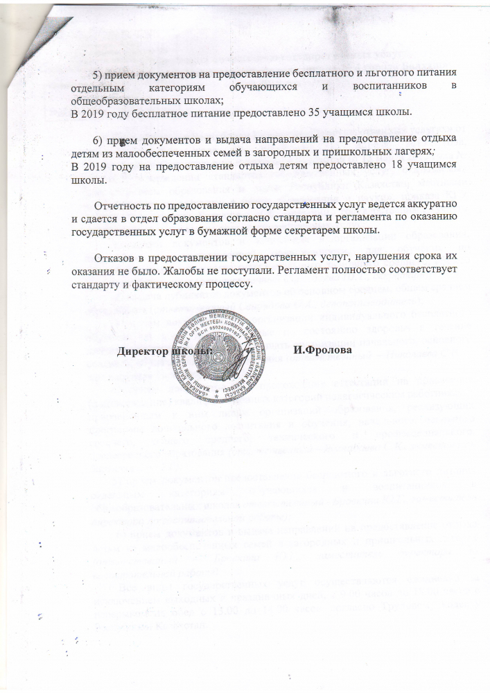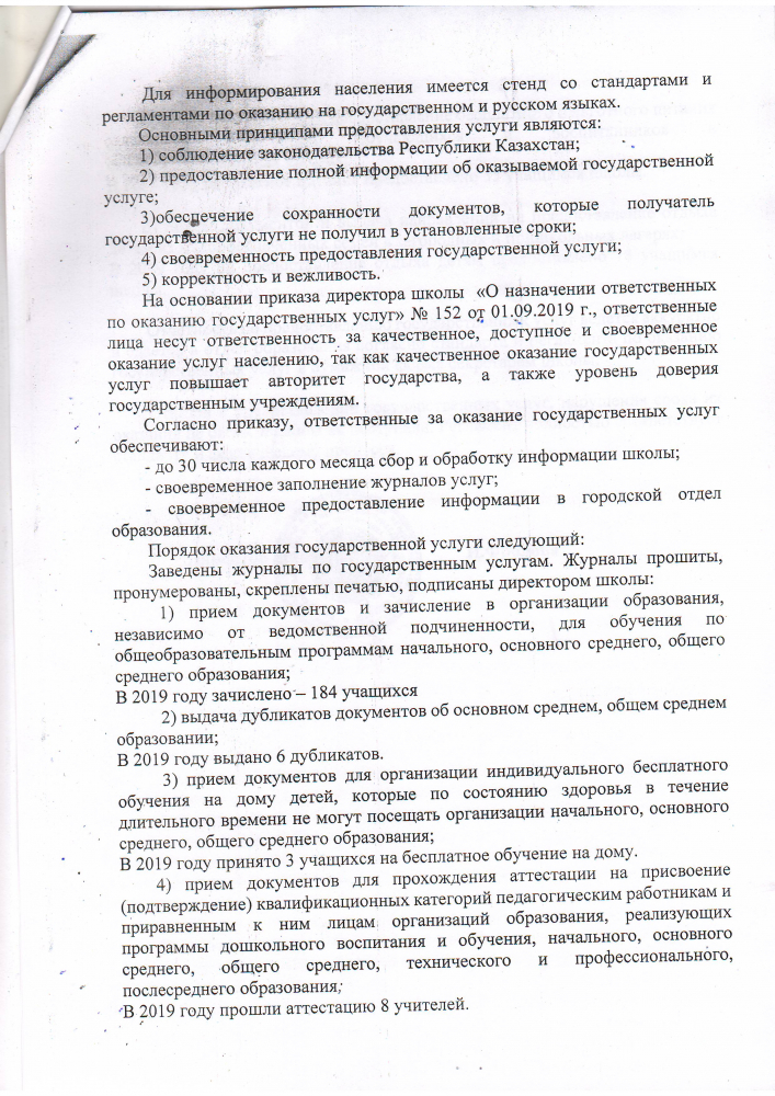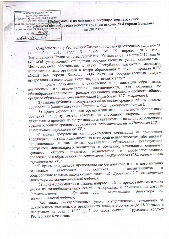 Информация по оказанию государственных услуг в КГУ "Общеобразовательная средняя школа № 4 города Балхаш" за 2019 год
