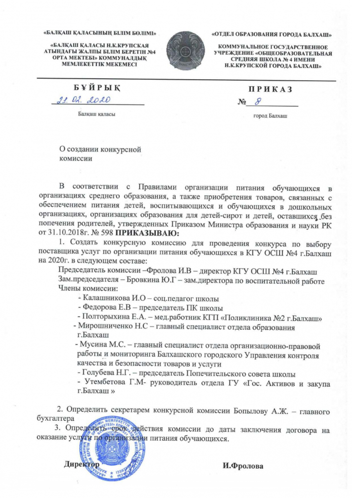 Приказ "О создании конкурсной комиссии" № 8 от 21.02.2020 г.
