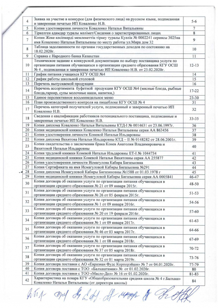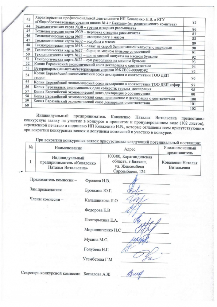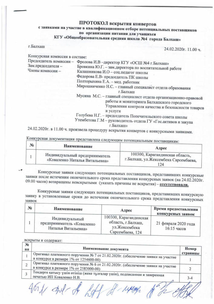 Протокол вскрытия конвертов с заявками на участие в квалификационном отборе потенциальных поставщиков по организации питания для учащихся КГУ "Общеобразовательная средняя школа № 4 города Балхаш"