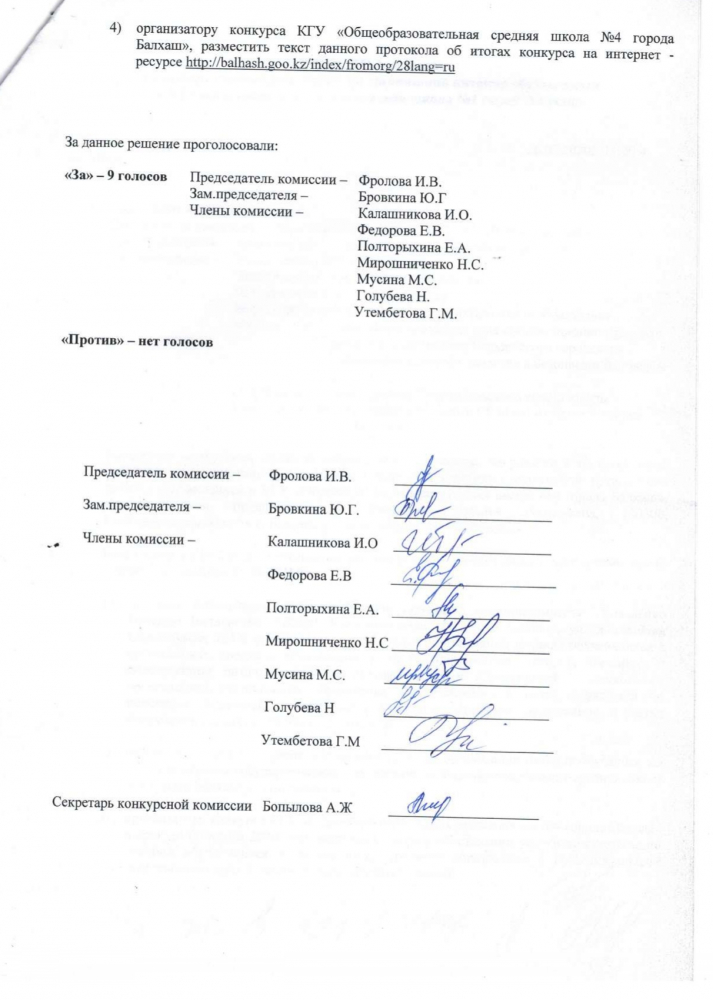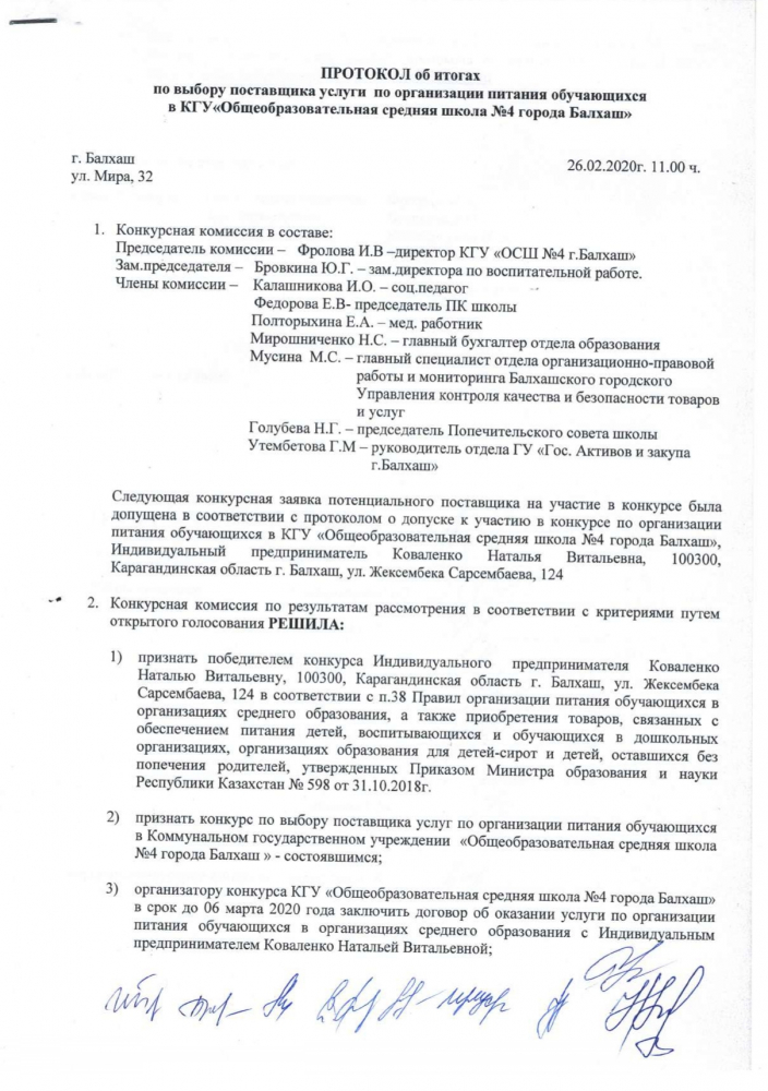 Протокол об итогах по выбору поставщика услуги по организации питания обучающихся в КГУ "Общеобразовательная средняя школа № 4 города Балхаш"