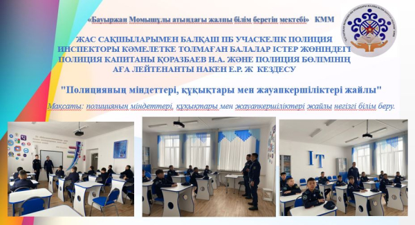 21.01.2025ж. күні мектебіміздің Жас Сақшыларымен Балқаш ПБ учаскелік полиция инспекторы кәмелетке толмаған балалар істер жөніндегі полиция капитаны Қоразбаев Н.А. және полиция бөлімінің аға лейтенанты Накен Е.Р. Ж кездесті. Оқушыларға "Полицияның міндеттері, құқықтары мен жауапкершіліктері жайлы" тақырыбында түсіндірме жұмыстарын жүргізді. Оқушылардың сұрақтарына жауап берді.