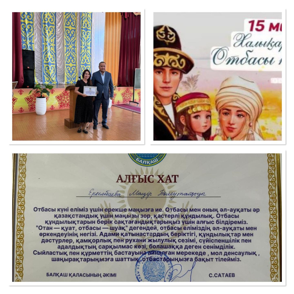 15 мамыр - Халықаралық Отбасы күніне орай қалалық формуда мектебіміздің ата-анасы Үлгілі де парасатты ана Еркембаева Мөлдір Төлеутайқызы қала әкімінің Алғыс хатымен марапатталды. Құттықтаймыз!!!