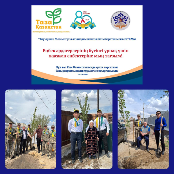 Ұлы Отан соғысындағы Жеңістің 80 жылдығына орай мектеп оқушылары қаламыздың еңбек ардагерлерінің ауласына тал отырғызды. Мақсаты: Қоршаған ортаны көгалдандыру, экологиялық мәдениетті арттыру және жас ұрпақтың табиғатқа деген жауапкершілік сезімін қалы