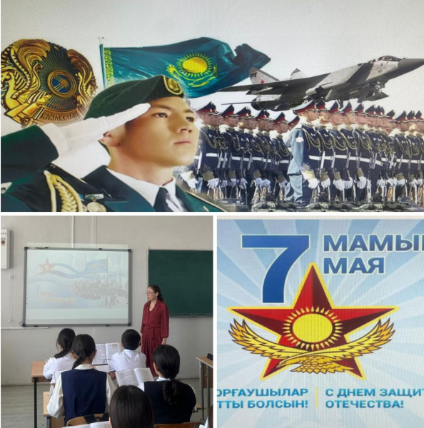 7 мамыр — Отан қорғаушылар күні. Мақсаты: — Бейбіт еліміздің құрыш қалқаны Қарулы Күштер туралы түсінік беріп, Отан қорғау ісі ең басты міндеттері екенін ұғындыру. — Оқушыларға Ұлы Отанды сүюге, ерлік көрсеткен батырлардың бойындағы ержүректілік, отан с