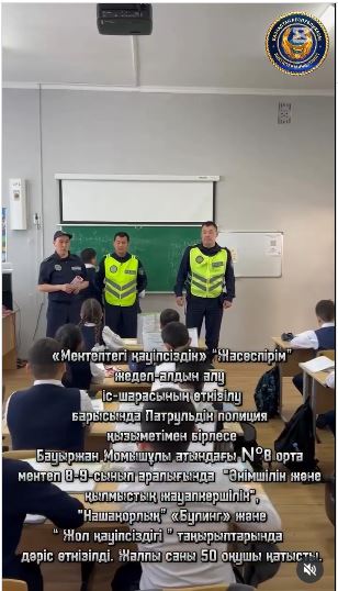 "Мектептегі қауіпсіздік" "Жасөспірім" жедел-алдын алу іс-шарасының өткізілу барысында Патрульдік полиция қызыметімен бірлесе "Бауыржан Момышұлы атындағы жалпы білім беретін мектепте" 8-9-сынып аралығында "Әкімшілік жене қылмыстық жауапкершілік", "Нашақорлық" "Булинг" жане " Жол қауіпсіздігі" тақырыптарында дәріс өткізілді. Жалпы саны 50 окушы қатысты.
