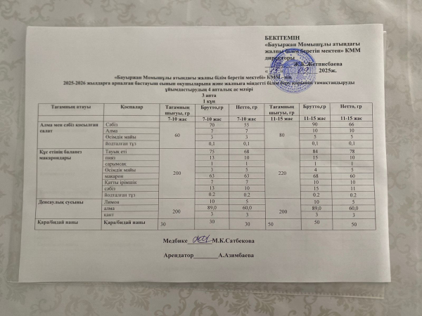 2025-2026 жылдарға арналған бастауыш сынып оқушыларына және жалпыға міндетті білім беру қорынан тамақтандыруды ұйымдастырудың 4 апталық ас мәзірі
