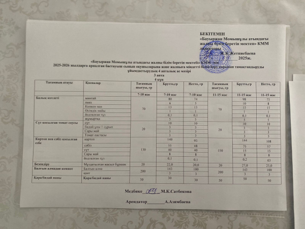 2025-2026 жылдарға арналған бастауыш сынып оқушыларына және жалпыға міндетті білім беру қорынан тамақтандыруды ұйымдастырудың 4 апталық ас мәзірі