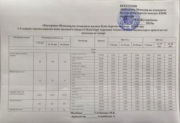 2025-2026 жылдарға арналған бастауыш сынып оқушыларына және жалпыға міндетті білім беру қорынан тамақтандыруды ұйымдастырудың 2 апталық ас мәзірі